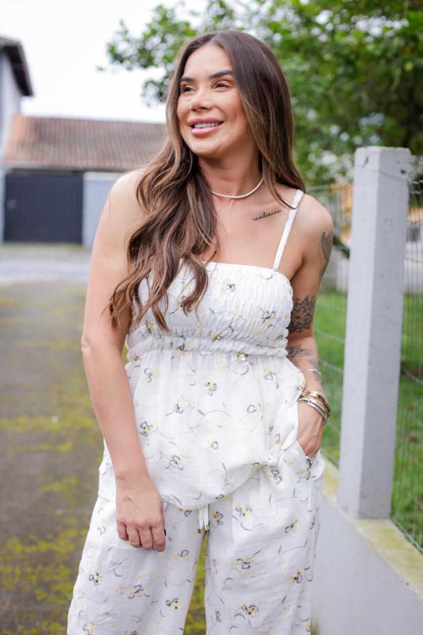 Composto por um top estilo bata, com elasticos na parte do seio, alças delicadas e com reguladores para que você possa ajustar, ele valoriza o colo e traz uma silhueta fluida e feminina.